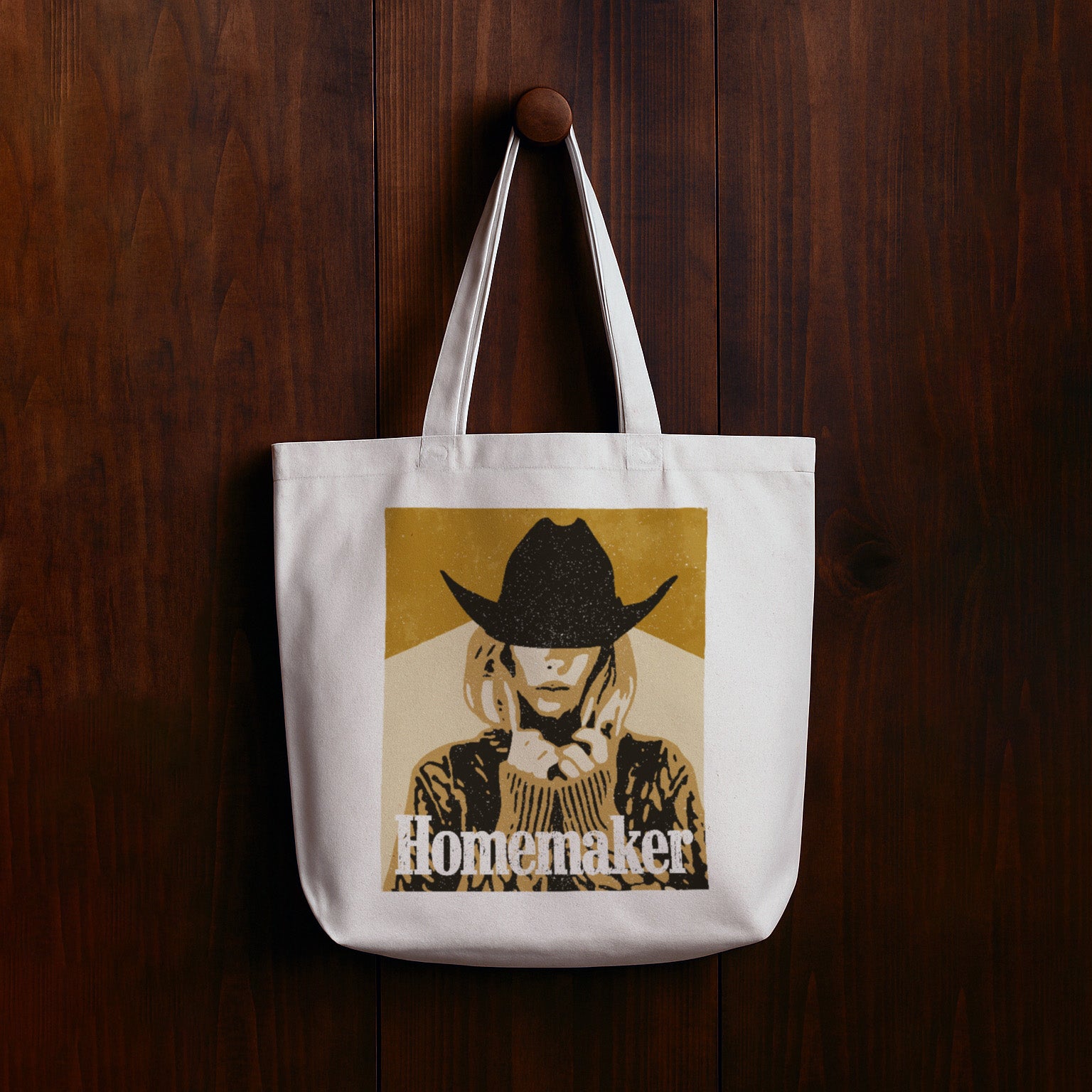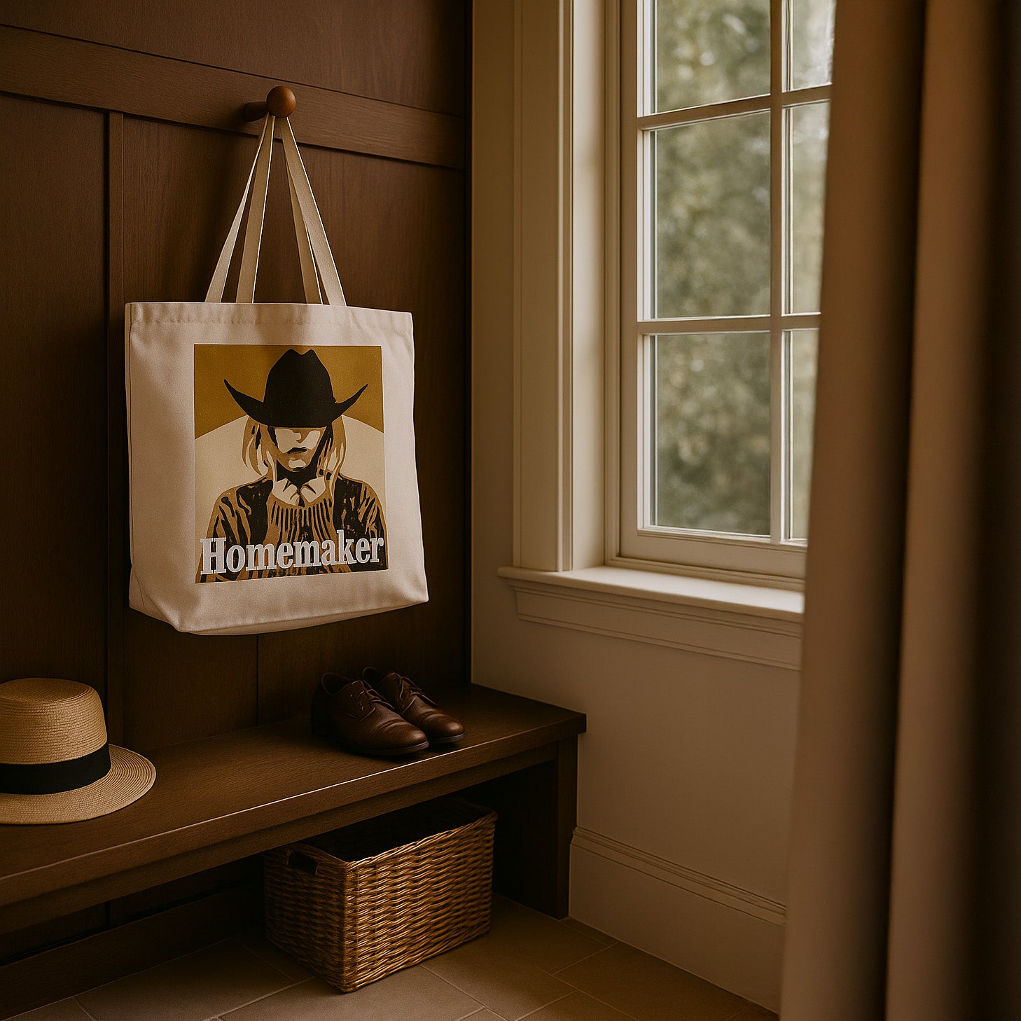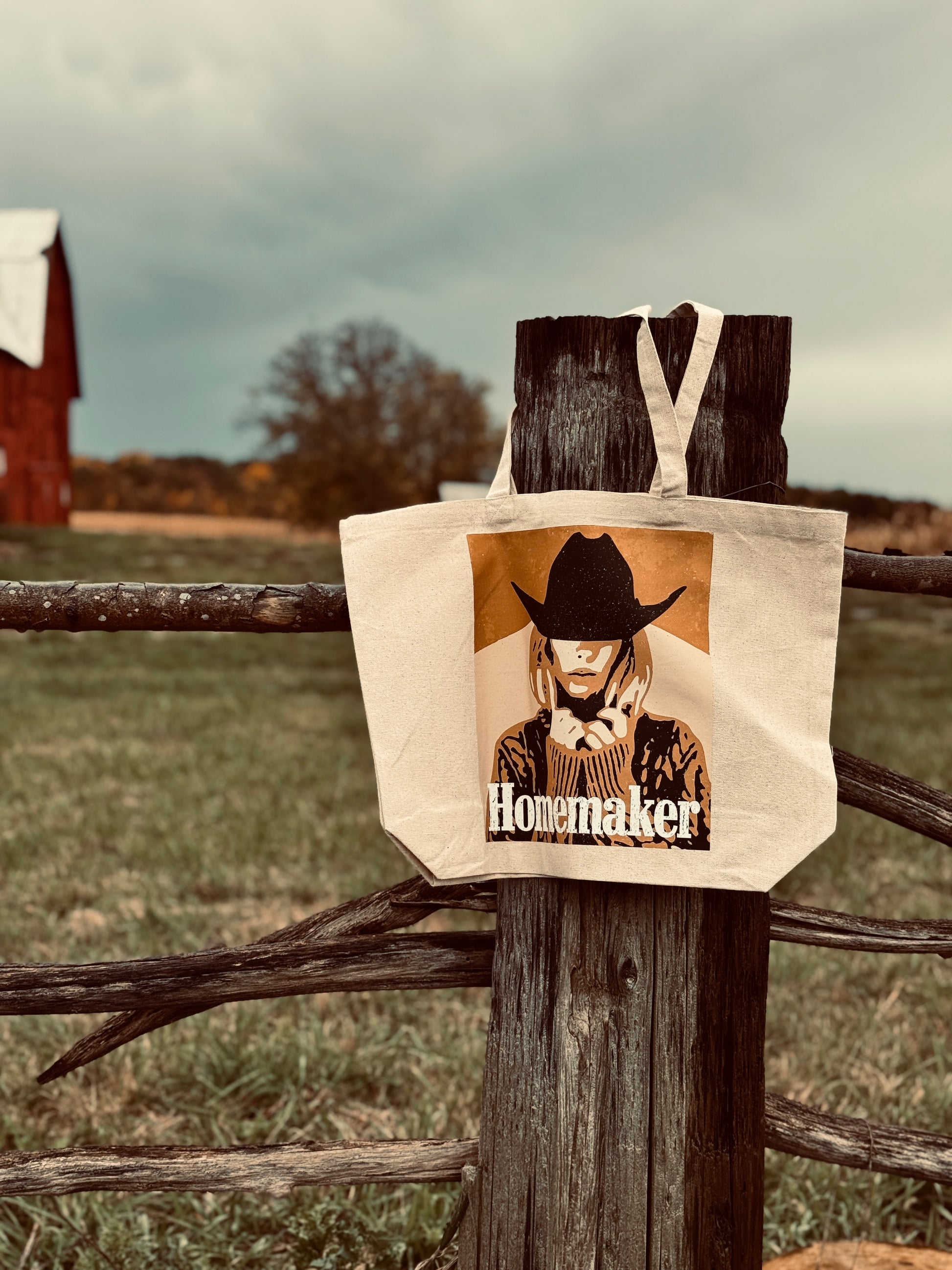 The Homemaker design celebrates grit and grace, featuring our signature cowgirl artwork printed on natural cotton canvas. With its 22-inch handles and roomy 20” x 15” x 5” shape, it carries everything from groceries to gear with ease.